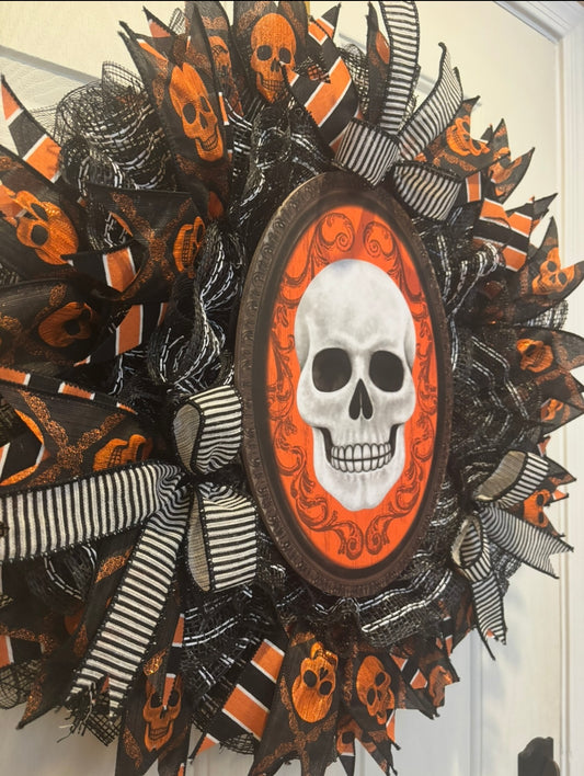 Halloween Orange & Black Classic Skull Handmade Custom Wreath