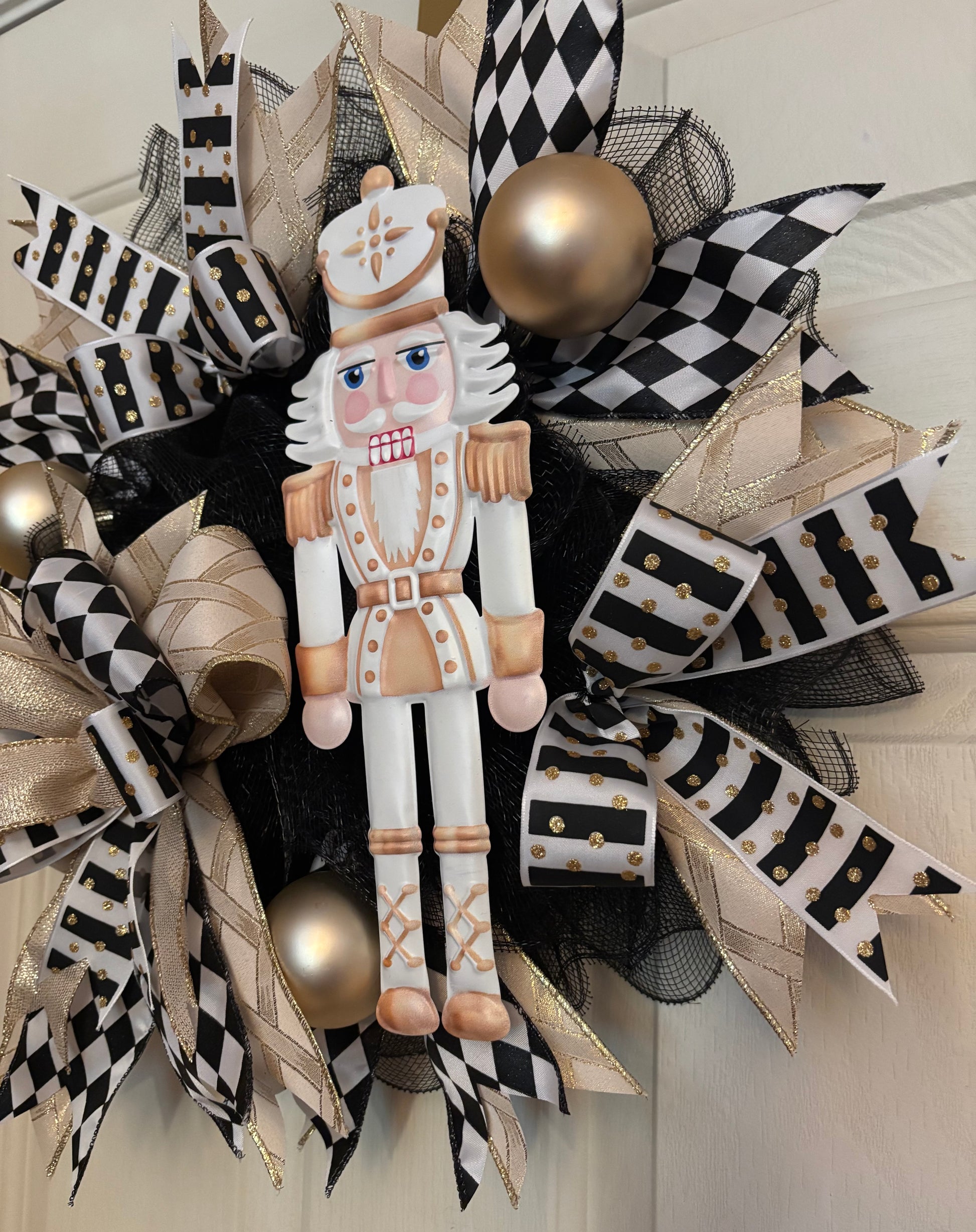 The base is black deco mesh with the highlight being a metal Nutcracker dressed in coordinating white and gold with accents of gold shatter proof ornaments to complete the classic design.