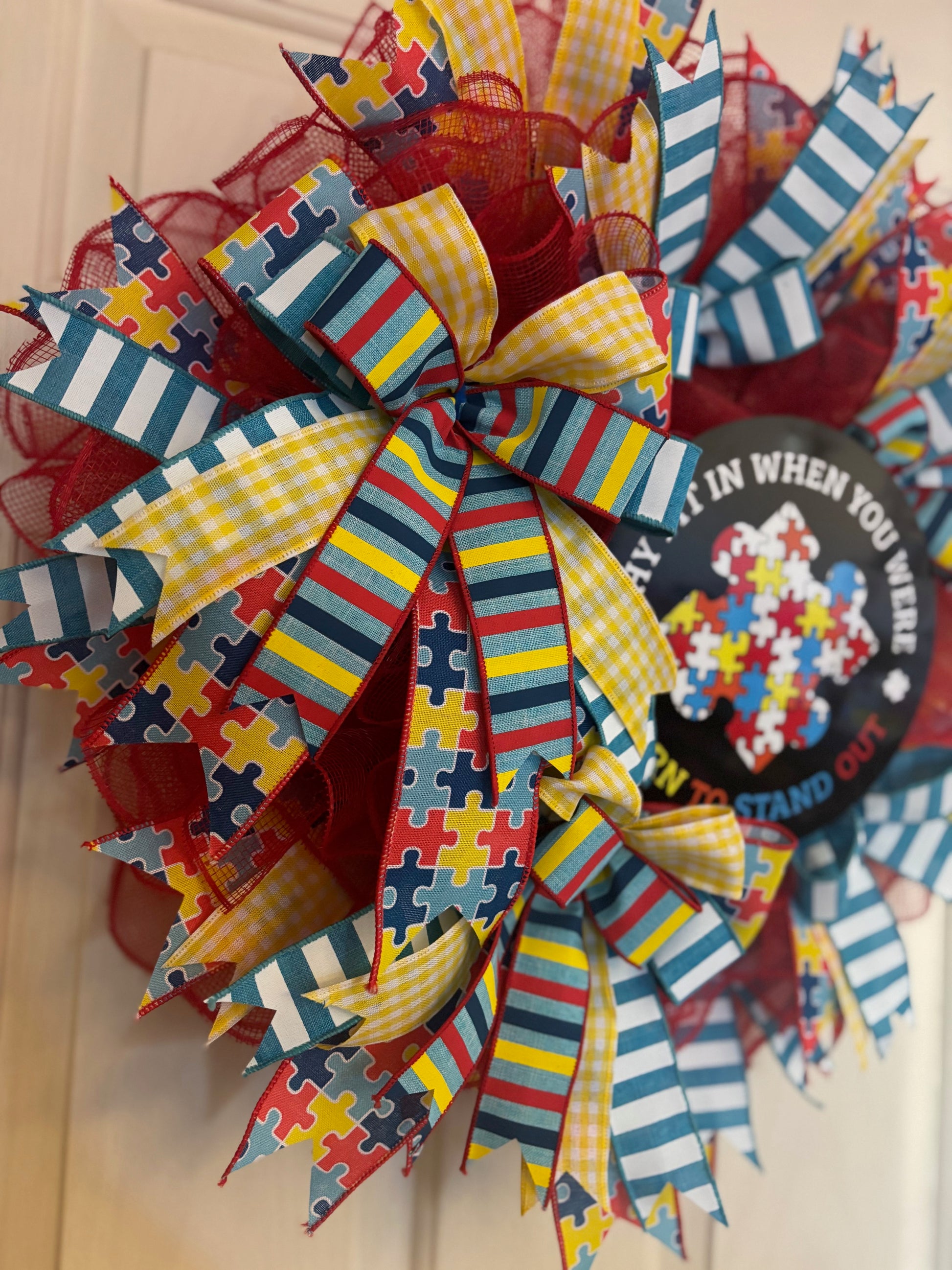 This Autism Awareness wreath features a vibrant design spot lighting "Why Fit In When You Were Made to Stand Out" metal sign surrounded by striped, checkered and puzzle pieces wired ribbon. This eye-catching wreath is the perfect tribute to raising Autism Awareness.