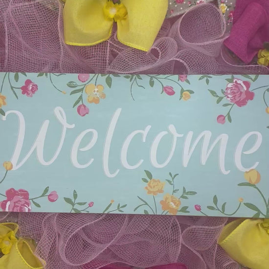 Welcome your guests with this bright floral themed wreath that will make them feel smile right away! This handmade wreath features a floral ‘Welcome’ sign that will make you feel like you can hear the birds chirping and the sun is shining and is surrounded by wired ribbon with coordinating yellow and pink rose buds for a cheerful welcome into your home, kitchen or garden.