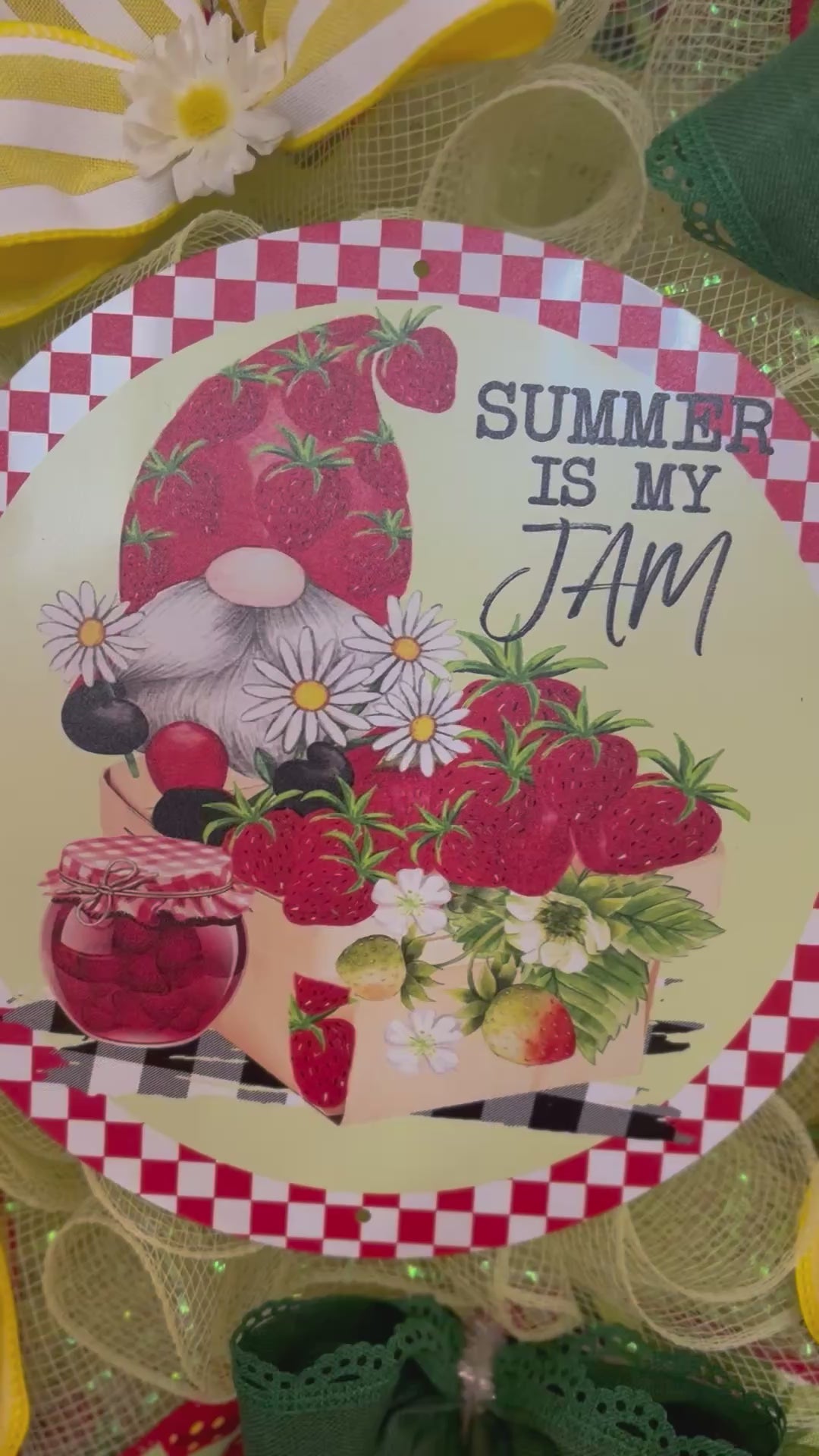 Welcome your guests with this whimsical wreath that clearly displays your love for gnomes & summer time! This handmade wreath features a sign announcing “Summer is my Jam” and is surrounded by wired ribbon with strawberries, deep green and bright yellow stripes for a cheerful welcome into your home or kitchen.