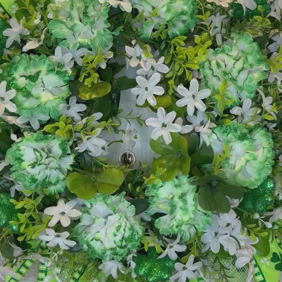 Welcome your lucky guests with this bright and whimsical wreath! This handmade wreath features a ring of glittery carnations and lucky shamrocks as extra focal points. The greenery includes baby eucalyptus, shamrocks and wispy lilies of the valley flowers on a foundation of wired shamrock ribbon and poly mesh. This wreath can be a focal point on any door or over a mantel piece to complete your Saint Patrick’s Day decorations!