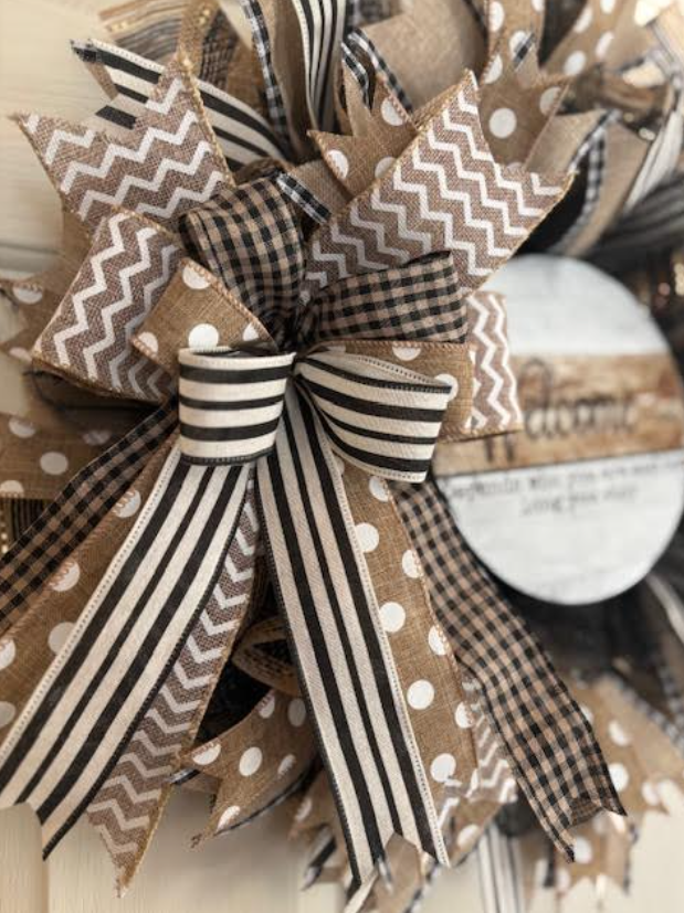 Welcome your guests with this wreath that clearly displays you have a sense of humor! This handmade wreath features a neutral combination of black & white stripes, tan & white polka dots, buffalo check and burlap accents for a cozy, rustic look.