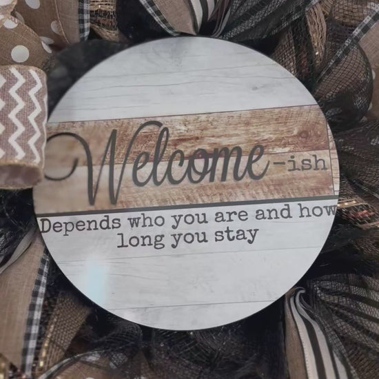 The centerpiece showcases a round metal sign that reads “Welcome-ish Depends on who you are and how long you stay” making it a perfect addition to any front door or entryway.