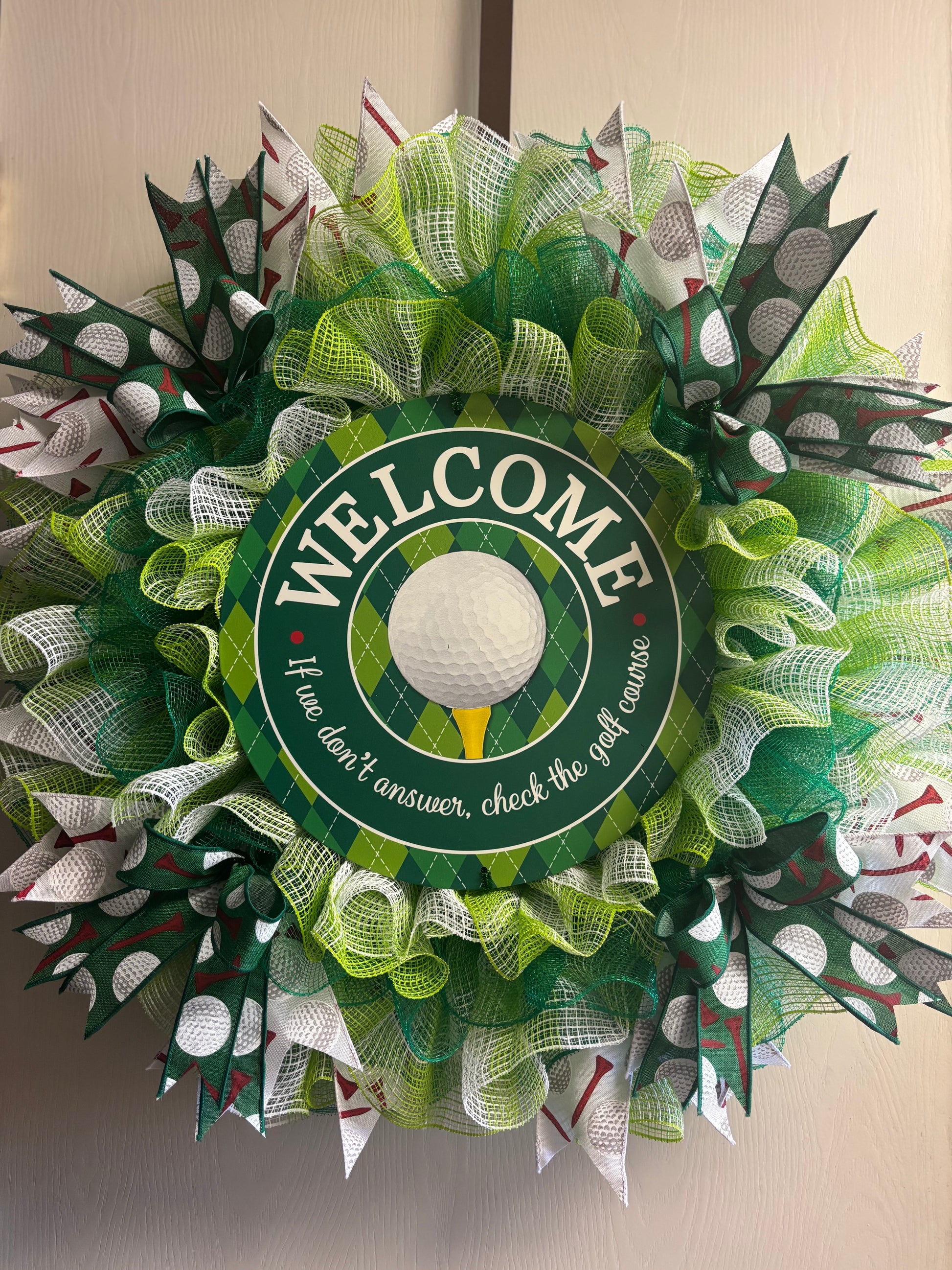 This wreath is designed around a metal sign featuring the phrase "Welcome - If we don't answer, check the golf course". The base is deco mesh in different shades to represent the course and is embellished with white and green wired ribbons featuring golf balls and tees.