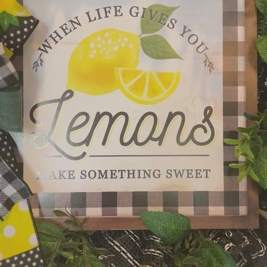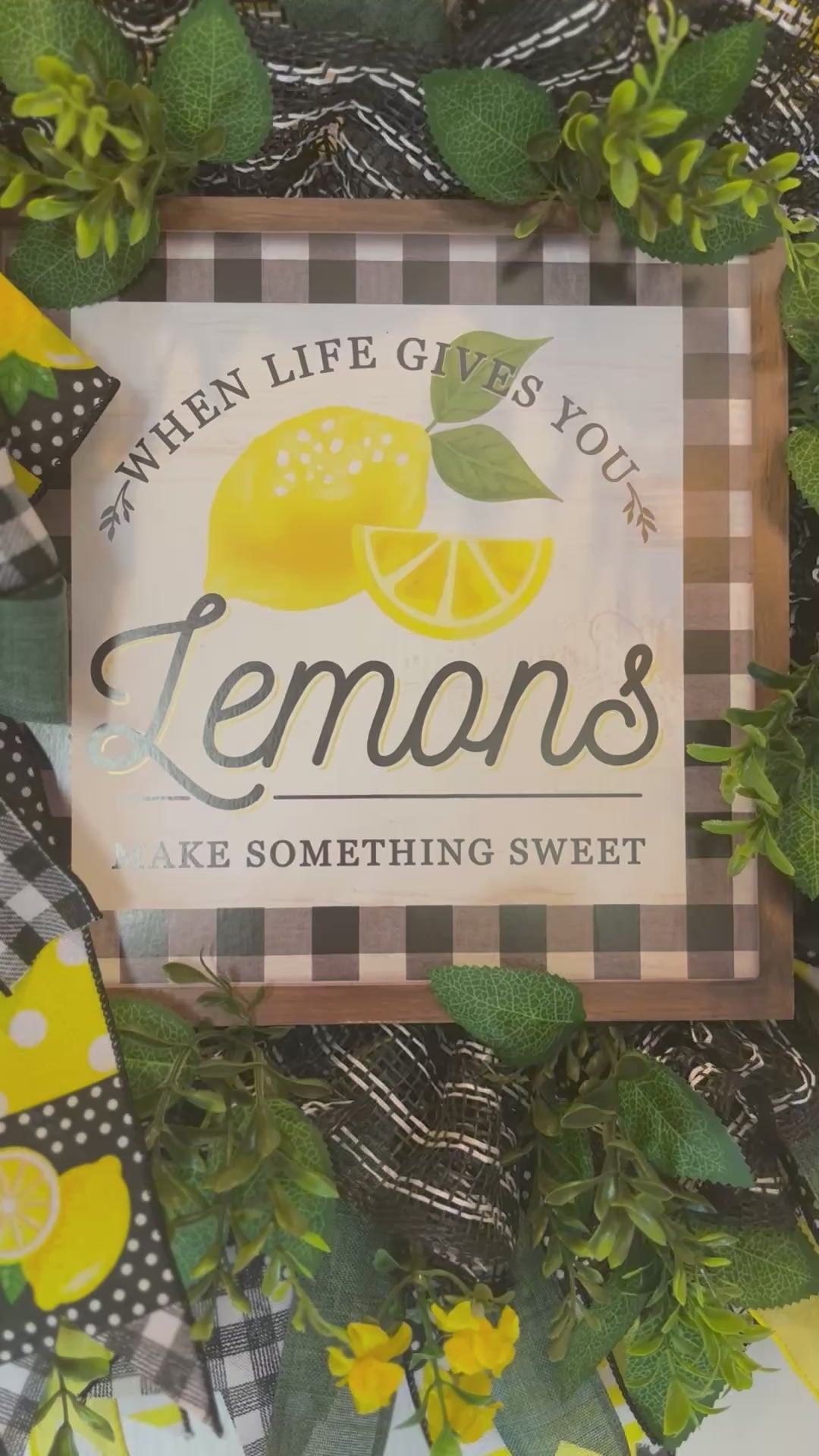 This is a handmade mesh and floral wreath with a perfectly framed inspirational message : “When Life Gives you Lemons Make Something Sweet”. This wreath is perfect for display spring through the summer months to add the right amount of brightness or complement your lemon décor.